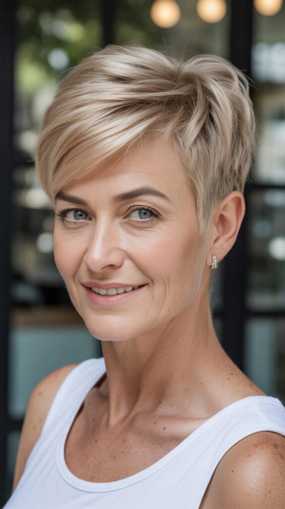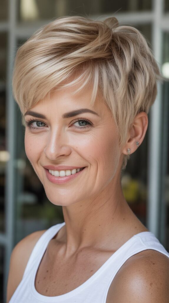 Layers at the crown create height and body, making hair appear fuller. A layered pixie cut adds instant volume to thin hair while remaining easy to maintain. Adding light styling cream or mousse enhances texture without weighing down the hair. The hairstyle is perfect for women looking for a chic, low-maintenance look. It’s flattering, modern, and works well both in a professional and a casual setting.