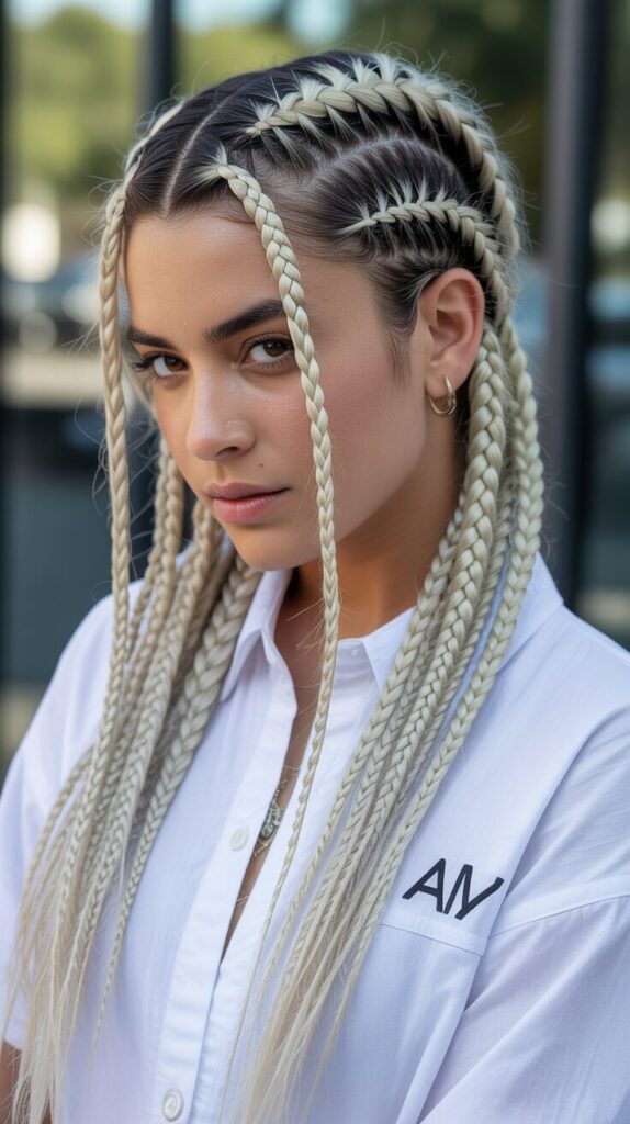 It is a promising trend to experiment with bleached blonde hair with baby braids to create a modern and daring look. This edgy style, seen on social media, brings an interesting twist on the classic braided hairstyle.