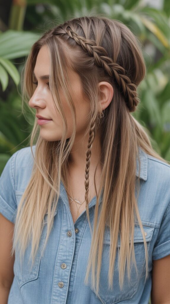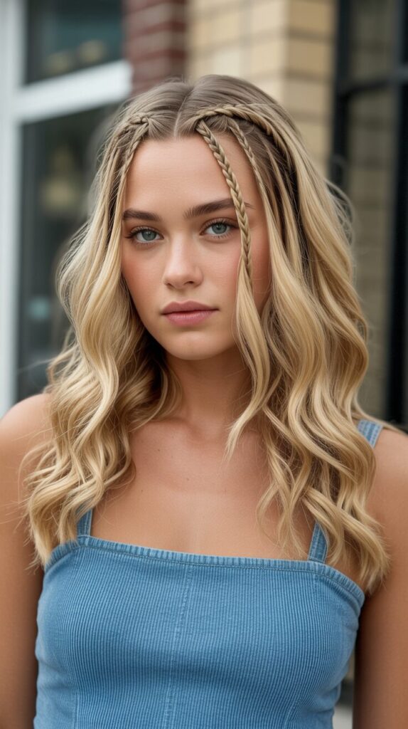 It will be easy for you to achieve a sun-kissed look with Medium Blonde Wavy Hair adorned with Face Framing Baby Braids. This style radiates warmth and sophistication at the same time.