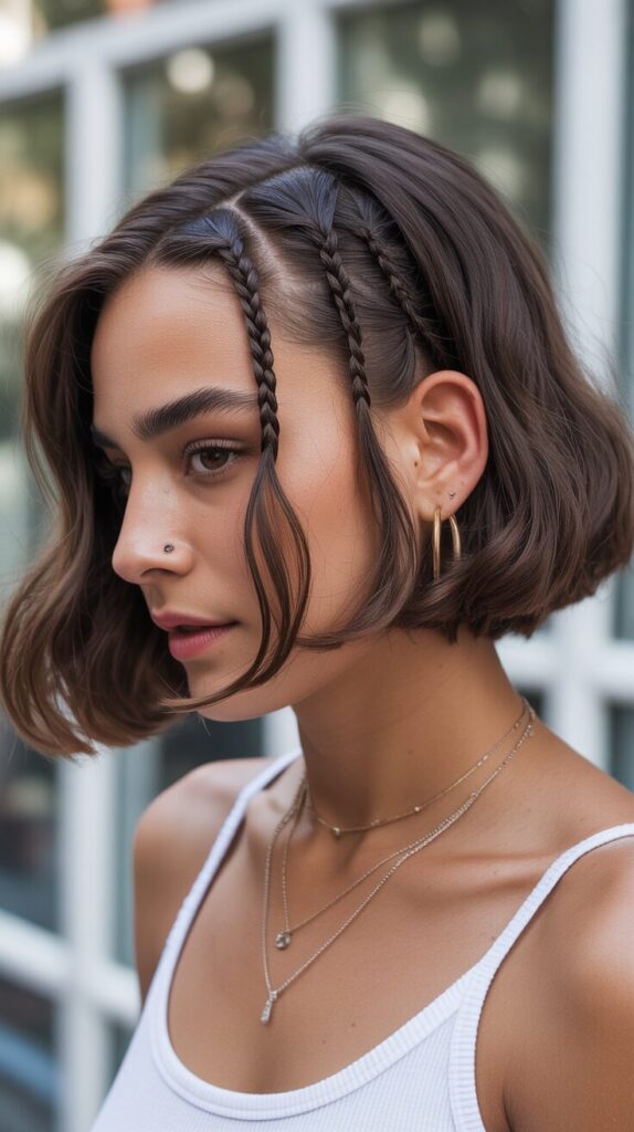 You will effortlessly enhance the overall allure of your short hair by incorporating Baby Braids into your brown Bob Cut. This simple yet sophisticated style will enhance the overall allure of your short hair.