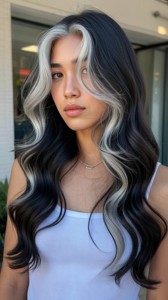 Adding silver highlights to your long, black, wavy hair creates the perfect balance between a classic and contemporary look, enhancing your natural beauty.