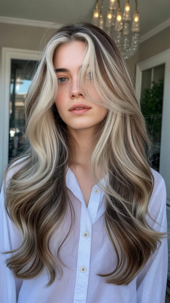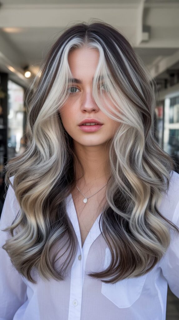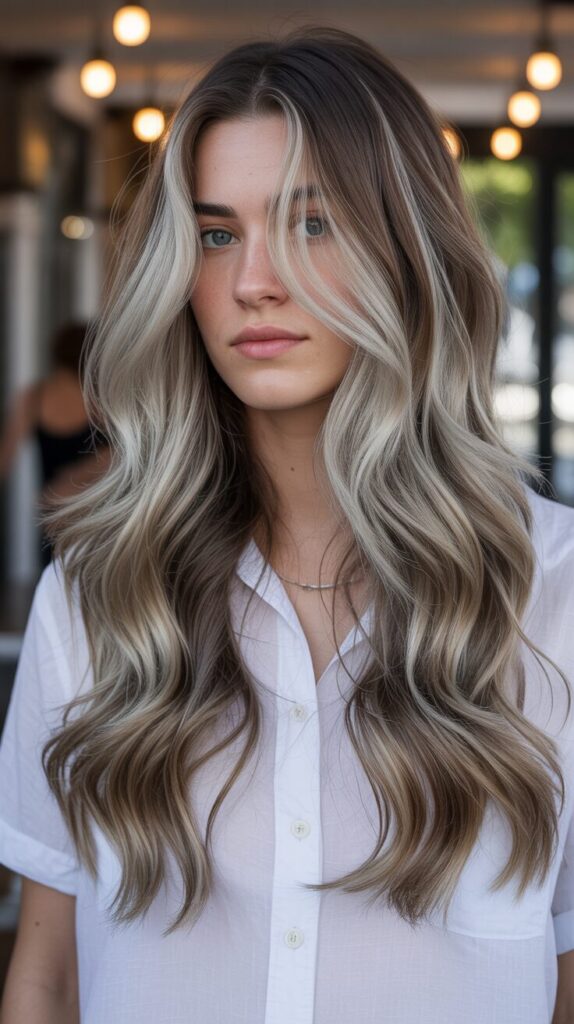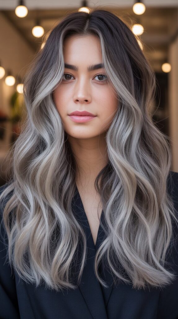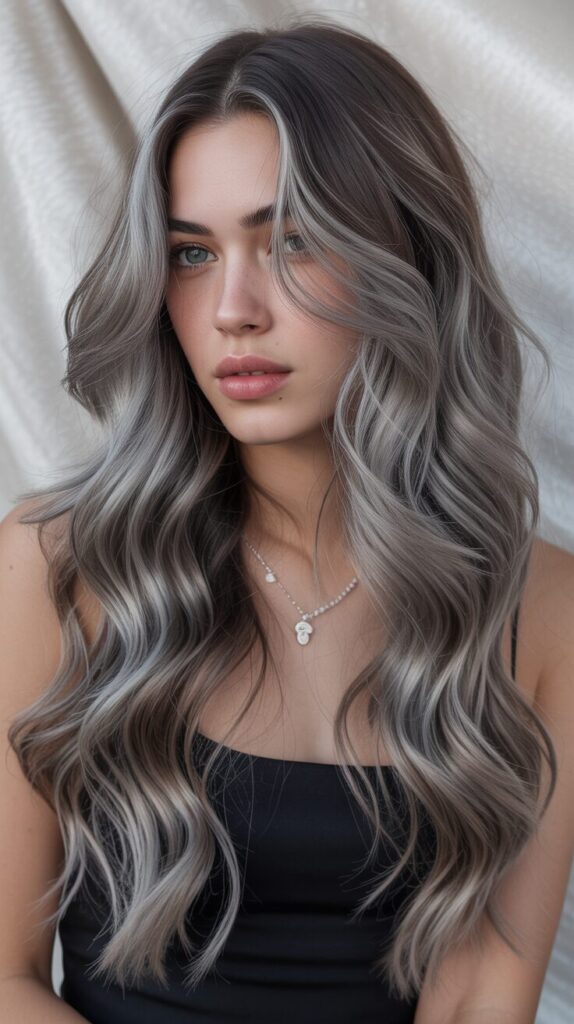 With long, wavy hair adorned with silver balayage babylights, you can achieve an enchanting look with your hairstyle, offering a subtle yet captivating touch to the style as a whole.