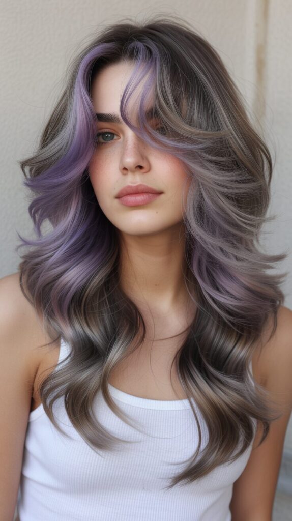 Take the essence of beachy waves and give them a sophisticated twist with the addition of smokey silver violet highlights on fluffy layered locks that create a playful and trendy look.