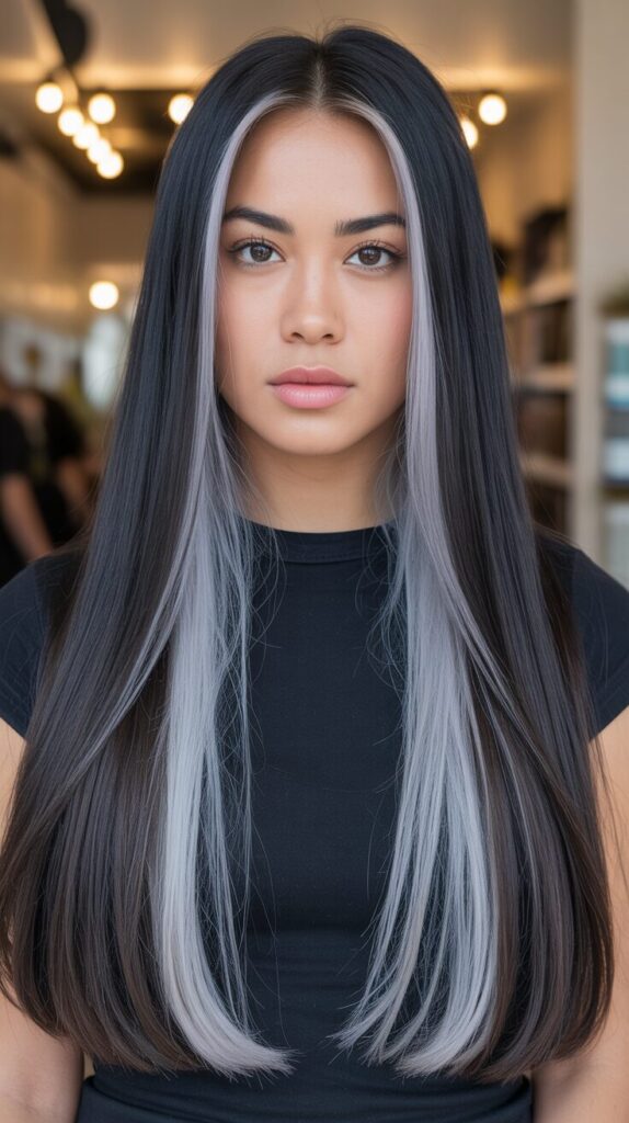 By incorporating under dyed silver highlights beneath long, sleek black hair, you can infuse an element of edginess into your style, creating a stunning contrast between the two.