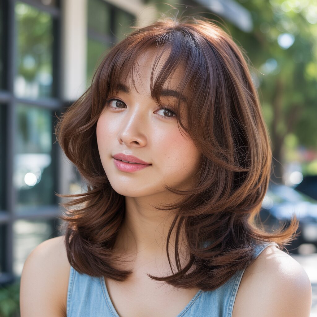 A Korean Style Brown Layered Hairstyle With Wispy Bangs