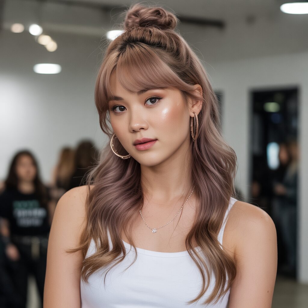 Make your inner K-pop star shine with a half-up half-down half-bun hairstyle featuring a K-Pop-inspired half-up half-down hairstyle, which radiates an energetic and fashionable vibe.