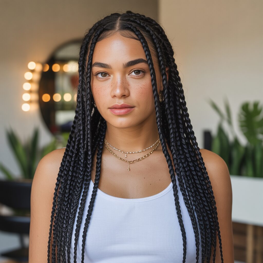 The allure of knotless braids on long black wavy hair embodies a timeless yet contemporary look that radiates confidence with its timeless yet contemporary design.