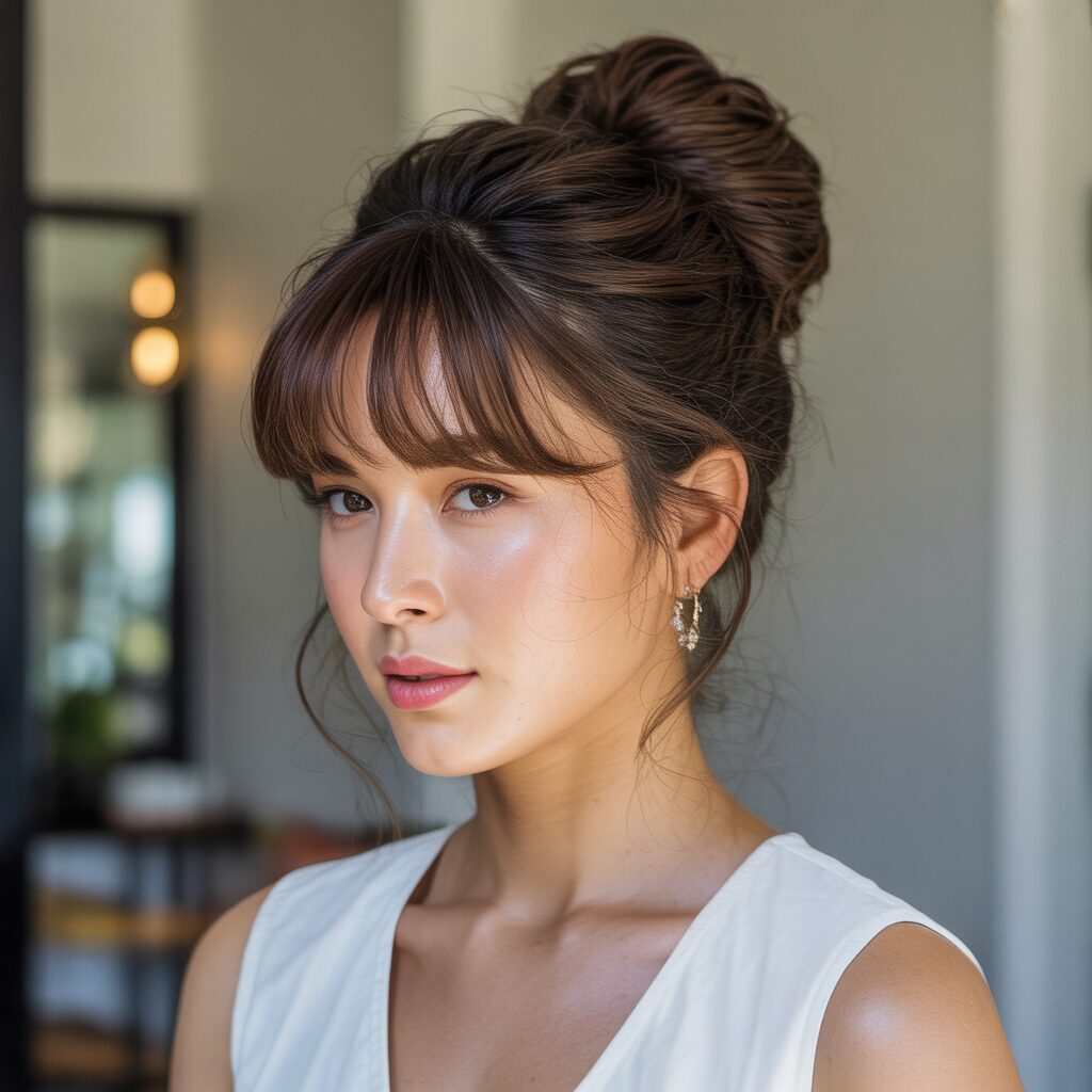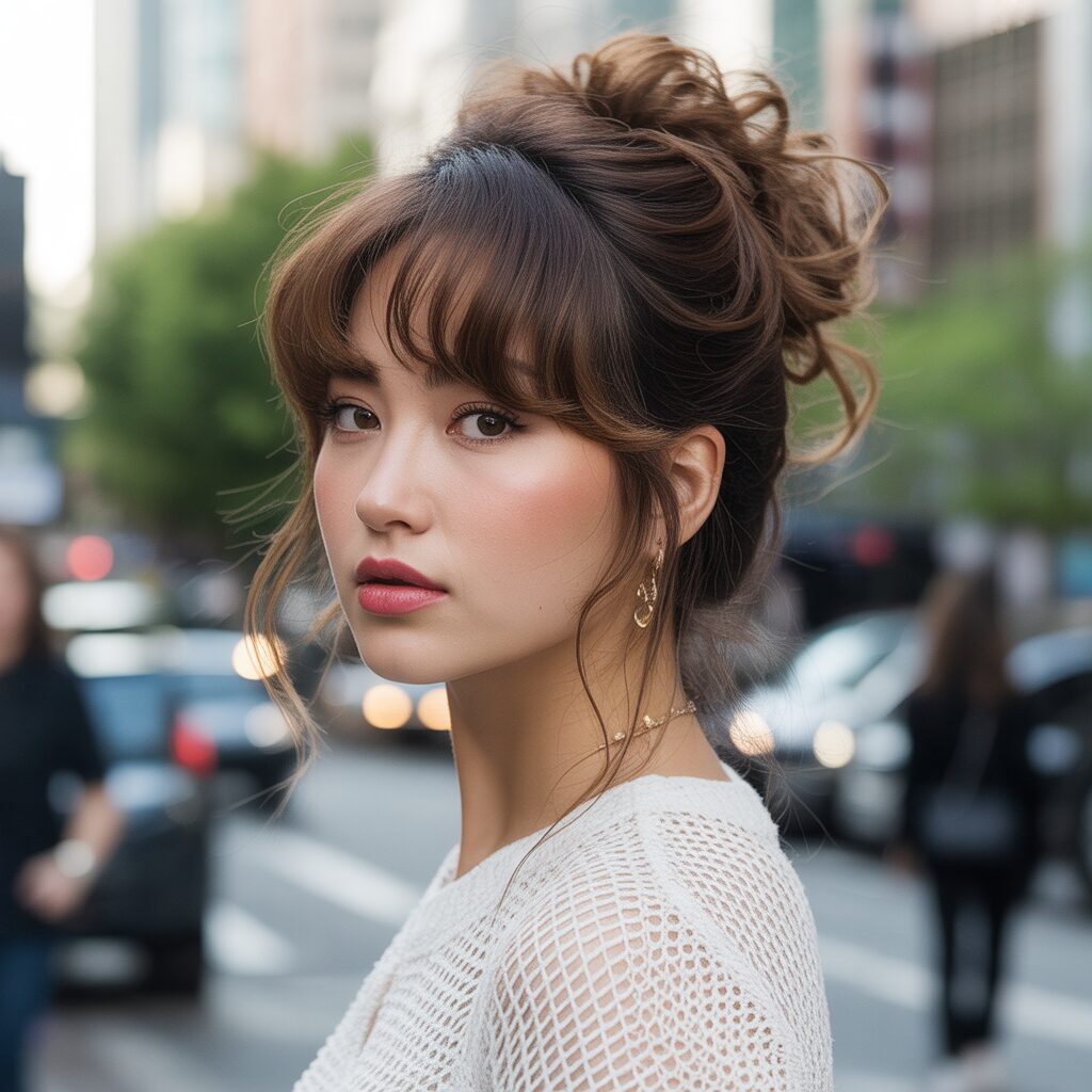 Make your style stand out with a fluffy messy updo featuring distinctive Korean bangs, enhancing the look of your chic persona with a touch of artful disarray.