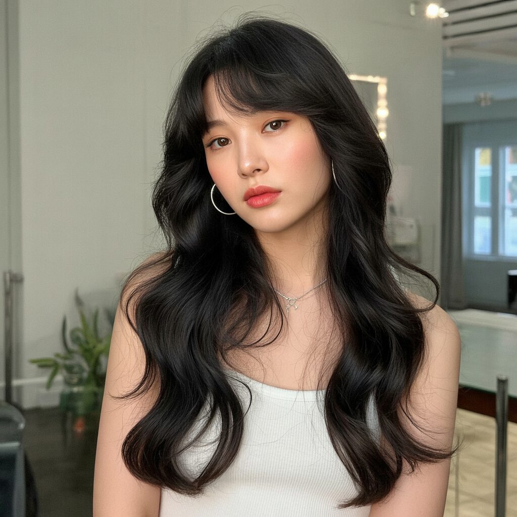 Enjoy a timeless and captivating aesthetic with long wavy black hair and curtain bangs that reflect a timeless and captivating world of Korean elegance.
