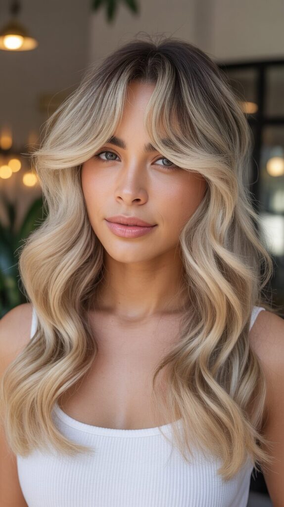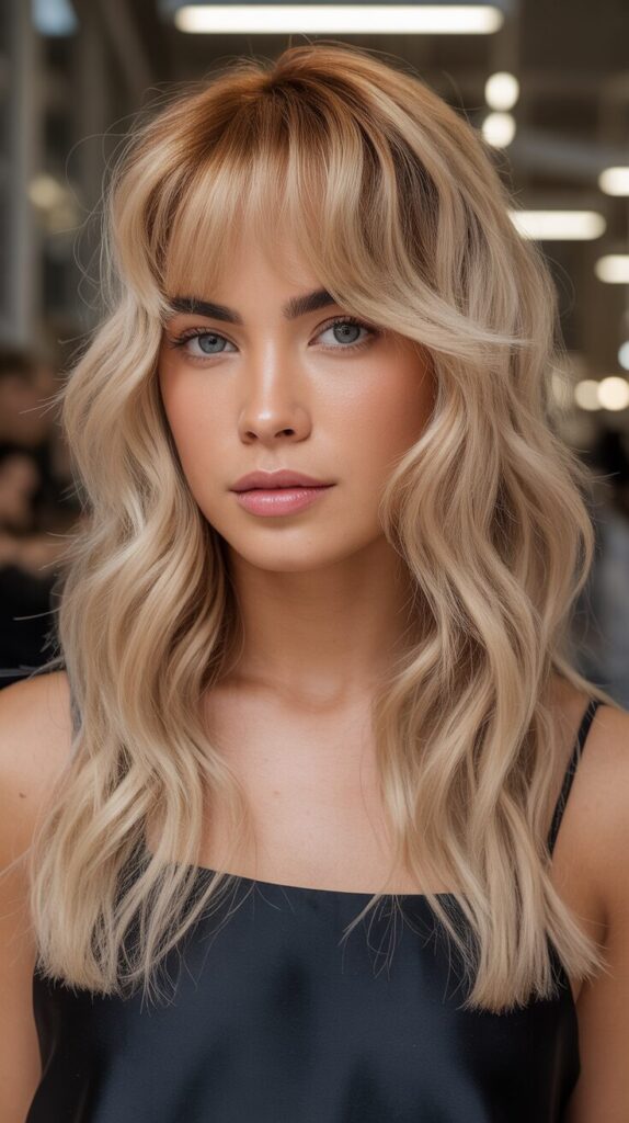 1.Blonde Malibu Wavy Long Wolf Cuts With Curtain Bangs