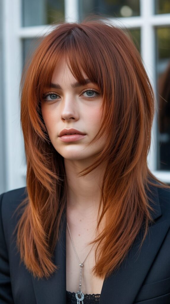 10. Auburn Layered Wolf Cut With Choppy Curtain Bangs