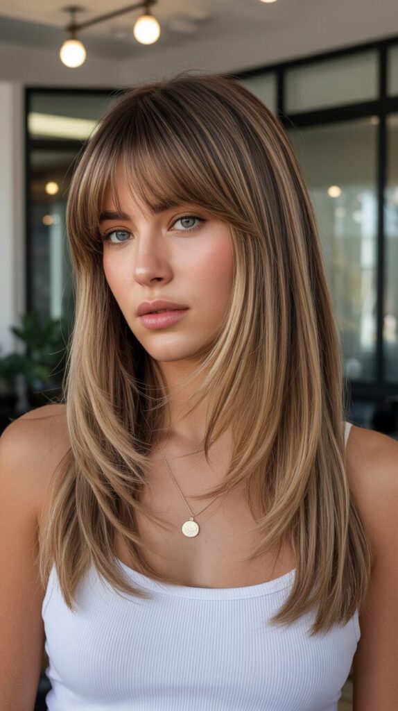 This long bronde wolf cut has elongated curtain bangs and face-framing layers that both enhance your face’s glow, and it can be a perfect choice for those with straight bronde hair, due to the elongated curtain bangs and face-framing layers.