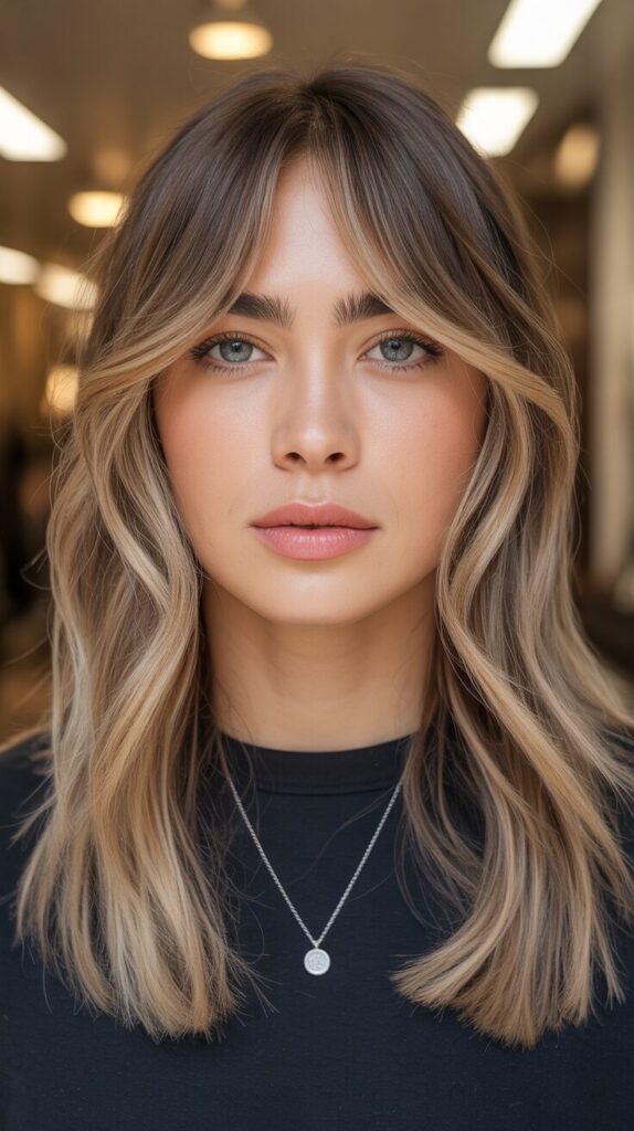 12. Face-Framing Long Bronde Wolf Cut With Elongated Curtain Bangs
