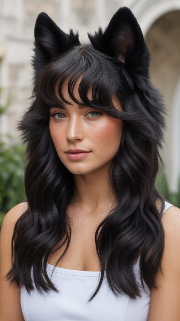 16. Long Black Wavy Wolf Cut With Extended Curtain Bangs
