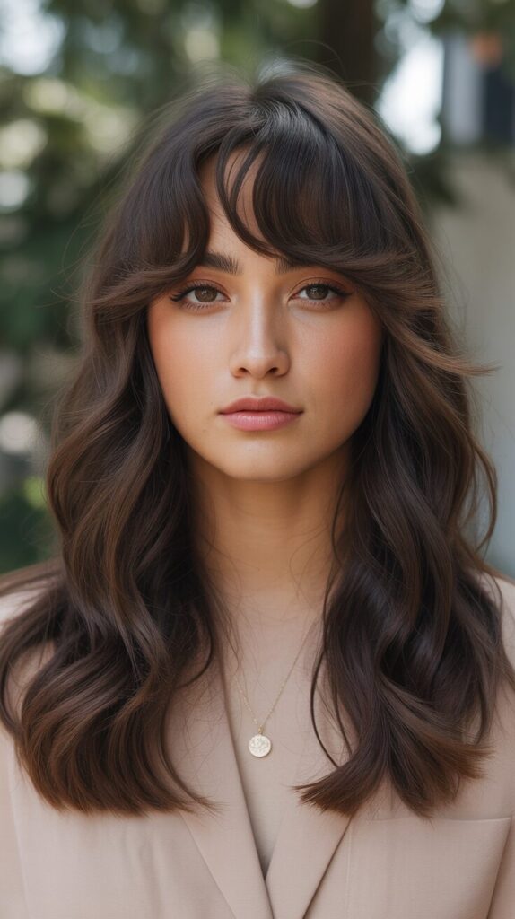 You can give your long chocolate brown flowing locks a new twist by giving them a wavy wolf cut coupled with bouncy curtain bangs if you have long flowing locks in chocolate brown.