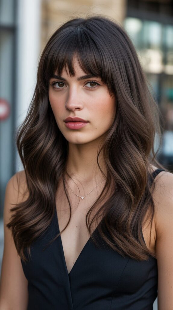 In this look, I’d like to show you a new and classic look for those with dark brown straight hair, featuring curtain bangs and wolf cut layers which combine to create an elegant and charming style.