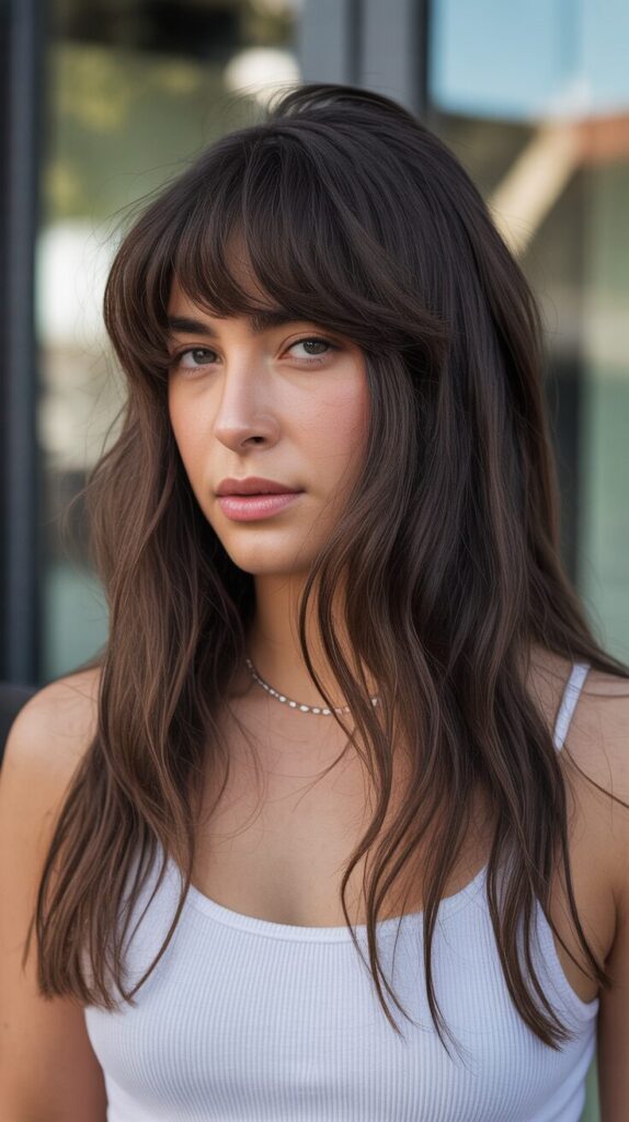 Adding a naughty vibe to your long dark brown hair with this long mullet wolf cut look with extended curtain bangs will make you feel like you are in the open air.