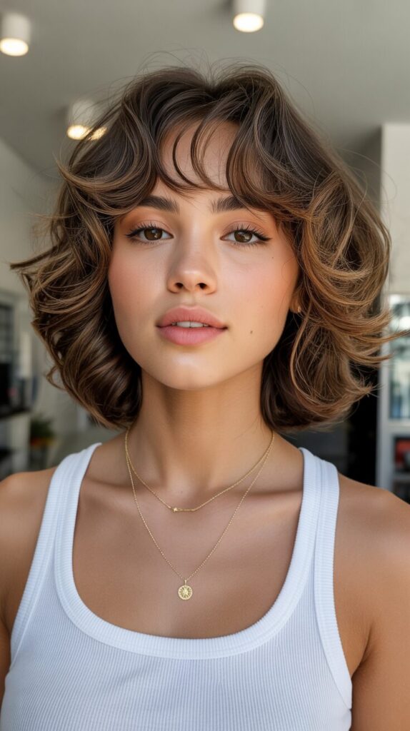 7. Brown Wavy Wolf Cut With Wispy Curtain Bangs