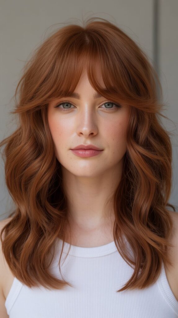 8. Wavy Dark Ginger Wolf Cut With Curtain Bangs