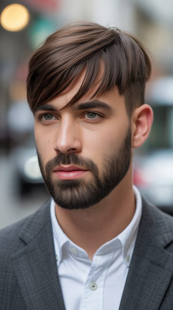 You can shape and style your face with this Mod with Angular Fringe with Beard. With an angled fringe and a beard that adds a grown-up touch, the fringe cuts across the forehead in a cool, stylish way.