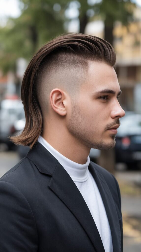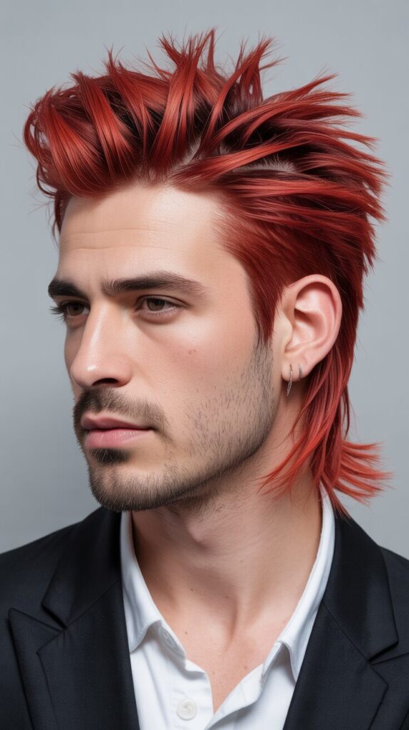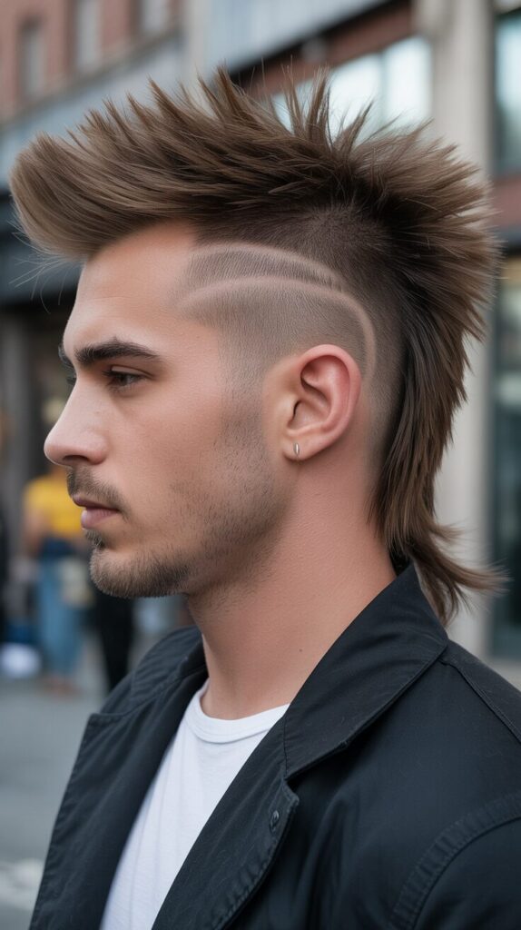 A Mullet Faux Hawk blends the edgy look of a faux hawk with the long flow of a mullet. The sides remain tight, while the center is bold, and the back is long.