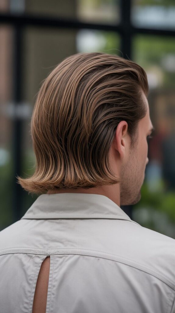 From behind, the mullet features long hair at the crown and nape, while the sides and front remain neat. Create sleek, vintage texture with a wide-tooth comb and light gel.