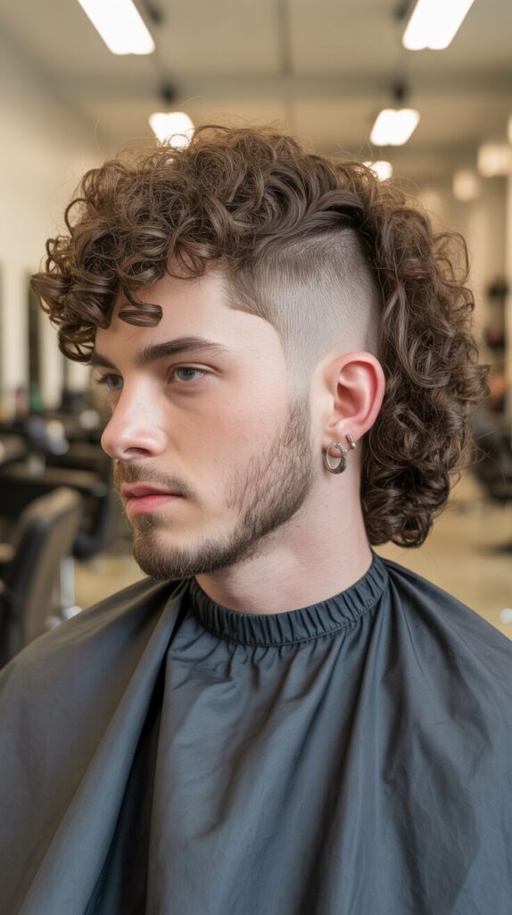 This mullet features curly curls created by a perm along with a tapered fade for a sharp appearance.