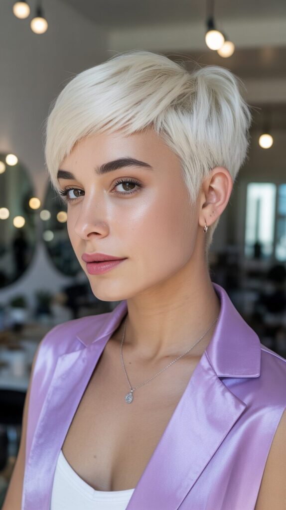 With this platinum blonde pixie bob you’re looking amazing. The brightness really wakes up your face and when used once a week with a purple shampoo you’re never going to have to worry about it turning brassy again.