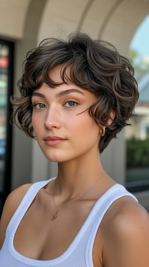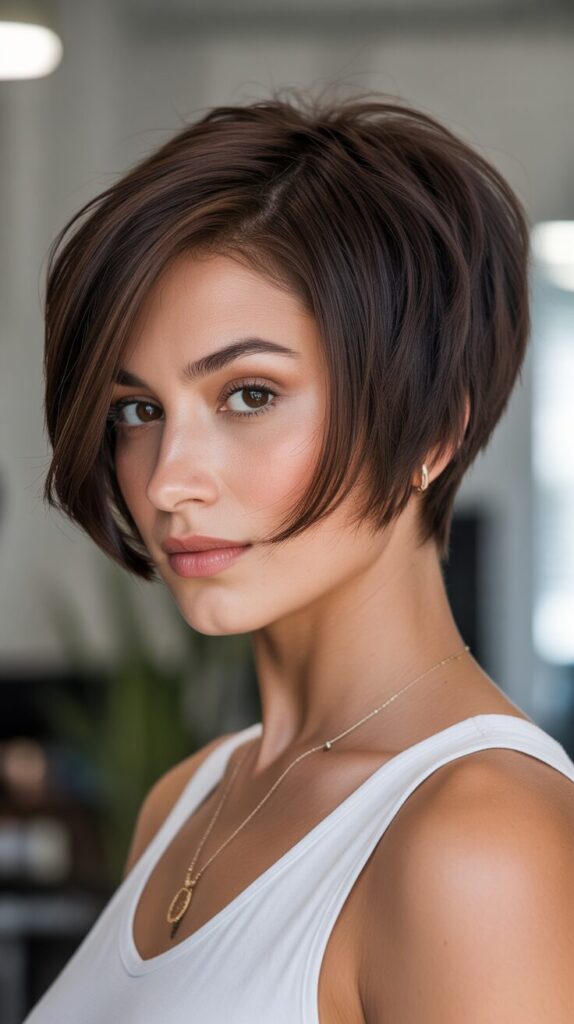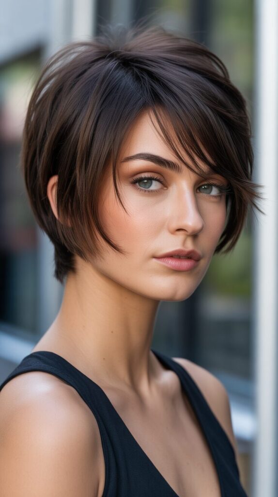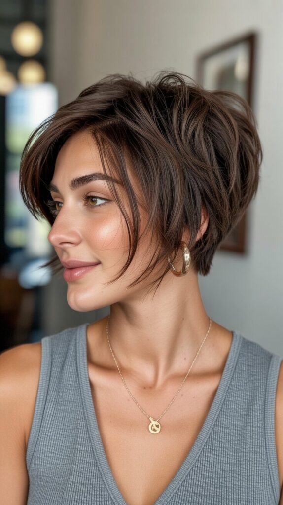 I have created a richly layered dark brown pixie bob that is super low-maintenance. I love how the layers create natural volume without the need for any work, which is perfect for busy mornings where you want to look somewhat put-together.