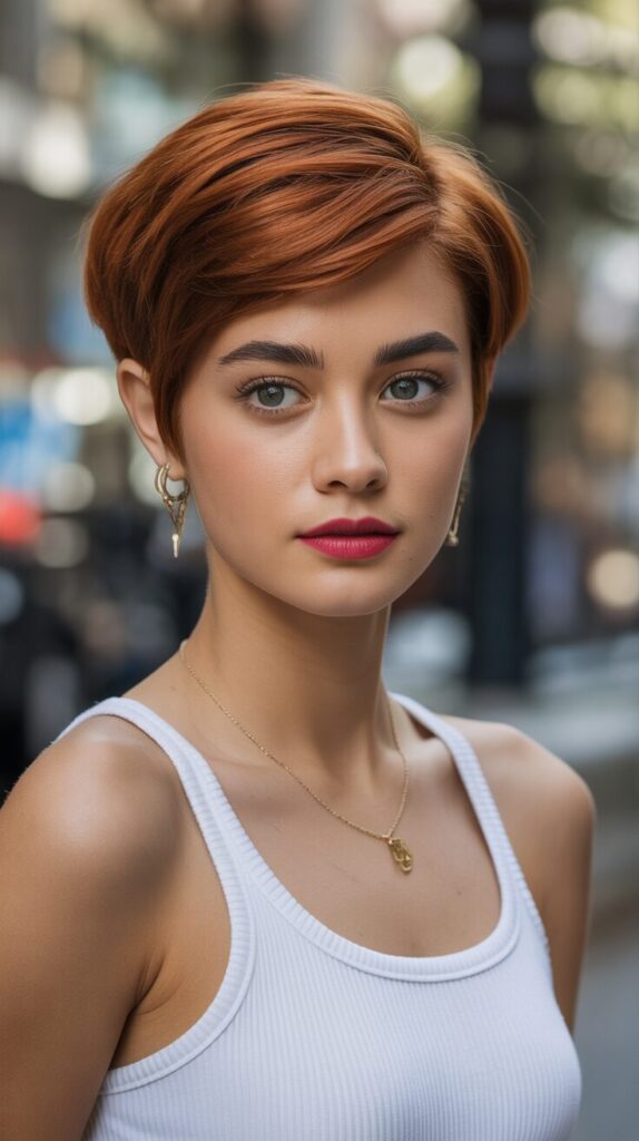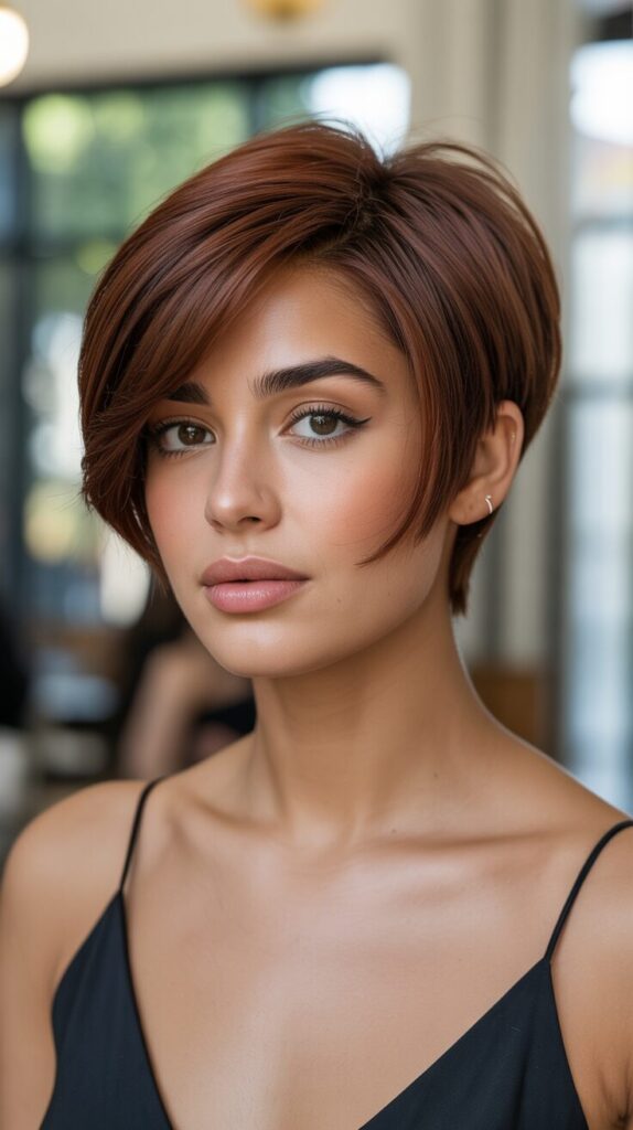 There is nothing better than an auburn pixie bob when it comes to finding the sweet spot between short and long. It never goes too long or too short. When you pull back the top, you can keep it short or keep it long depending on your desired look.