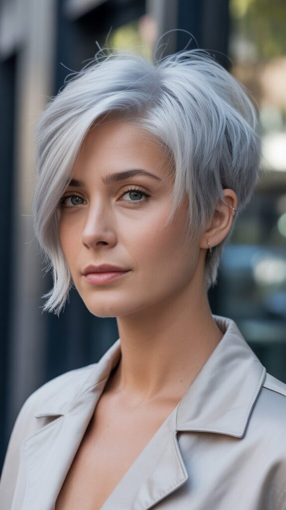 I love the way this silver pixie bob makes gray hair look intentional and stylish. The piecey texture feels so modern, particularly since it is done with a lightweight wax to separate sections to get that piecey appearance.