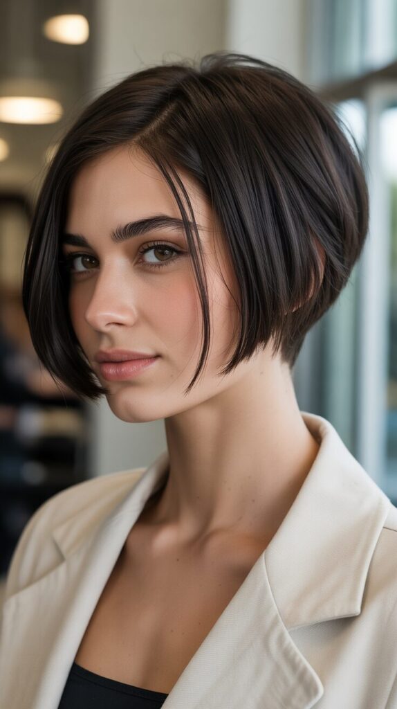 It sits perfectly at the nape, but keeps the volume on top. The graduation is cut just right, so it works with almost any face shape. This pixie bob style is so flattering with those subtle layers. The graduation sits perfectly at the nape, but keeps the volume on top.