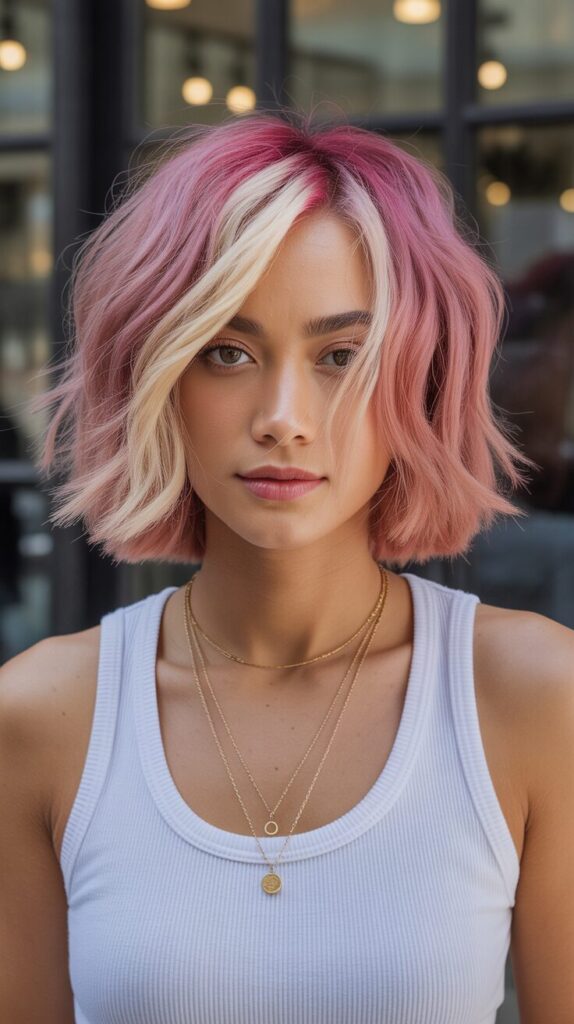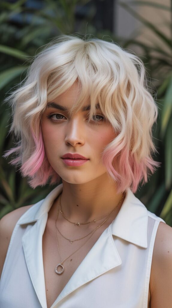 With a bleached blonde shaggy lob paired with playful pastel pink highlights, you’re sure to create a look that’s both daring and refined to push your boundaries in the world of edgy elegance.