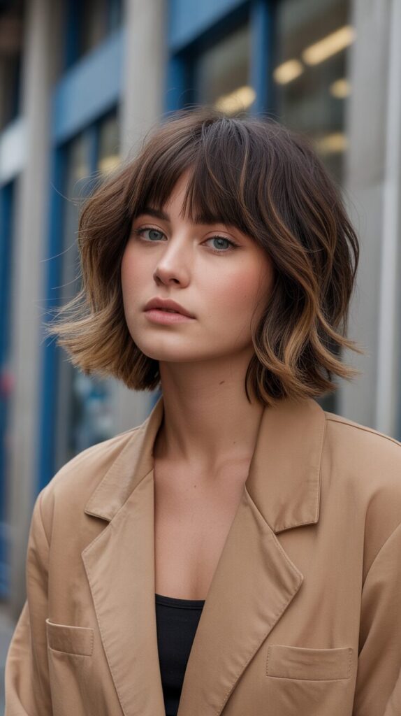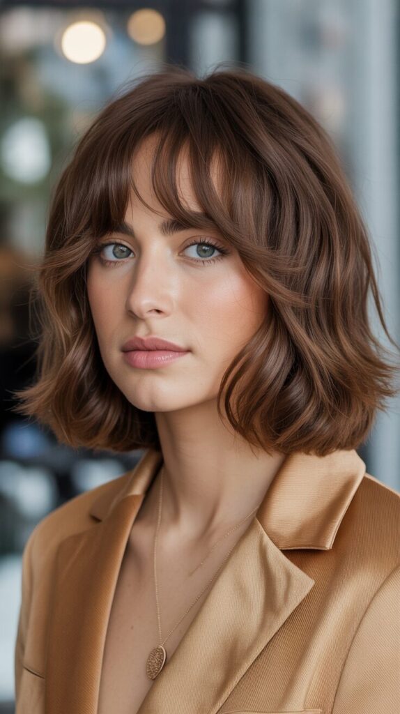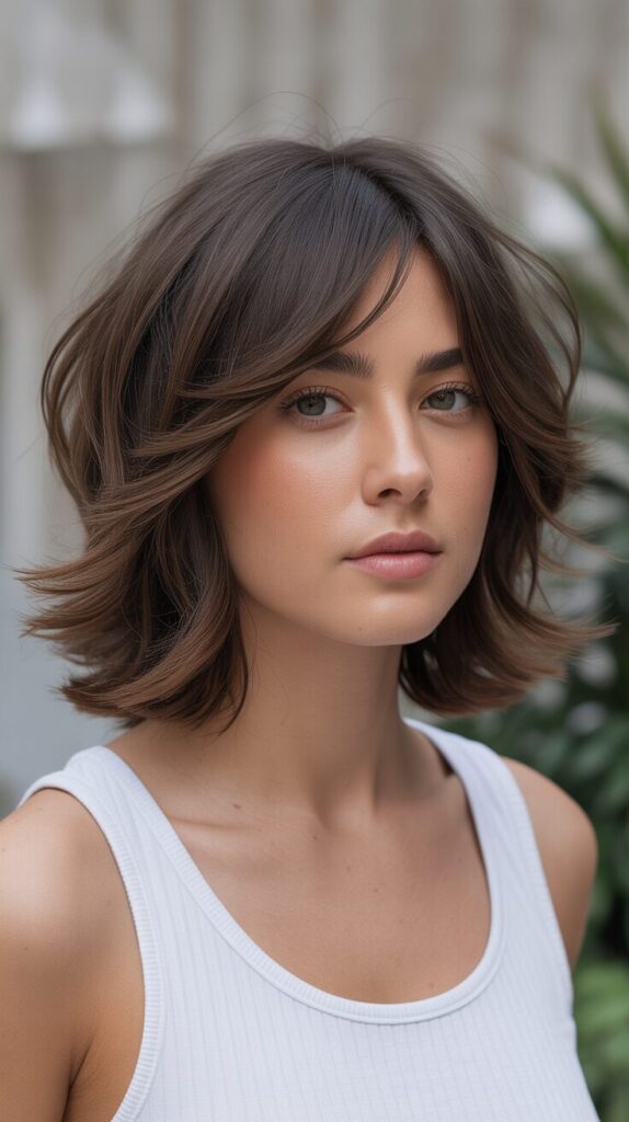 There are few hairstyles that have more style appeal than the shaggy lob on brown hair with curtain bangs, which strikes the perfect balance between sophistication and a carefree, laid-back atmosphere.