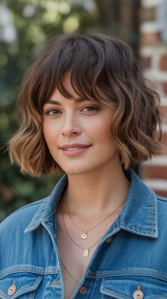 Itโs all about how you frame your face with style by wearing a soft wavy shaggy lob that is tailored to suit a round face and is complemented by wavy bangs that add a hint of whimsy and charm.