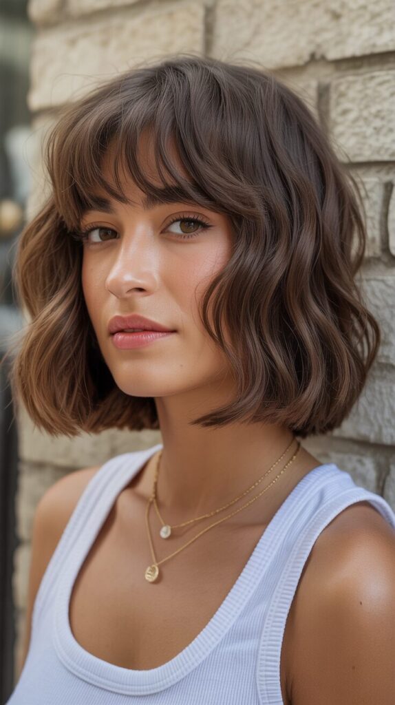 You can explore a contemporary take on the classic bob with a textured long bob paired with bangs, creating a stylish and versatile haircut that can be worn in many different ways.