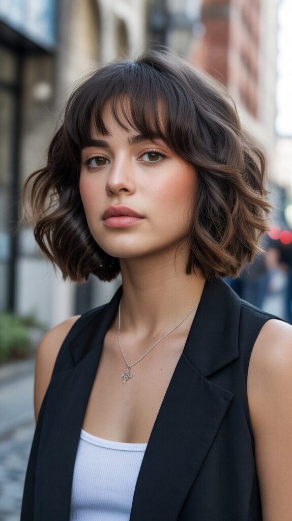 You can embrace the fusion of sophistication and playfulness with a brown wavy shaggy lob, adorned with long curtain bangs to give it a touch of drama, and you are sure to turn heads!