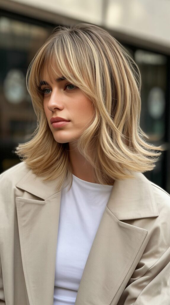 13. Blonde Balayage Shaggy Wolf Cut With Bottleneck Bangs