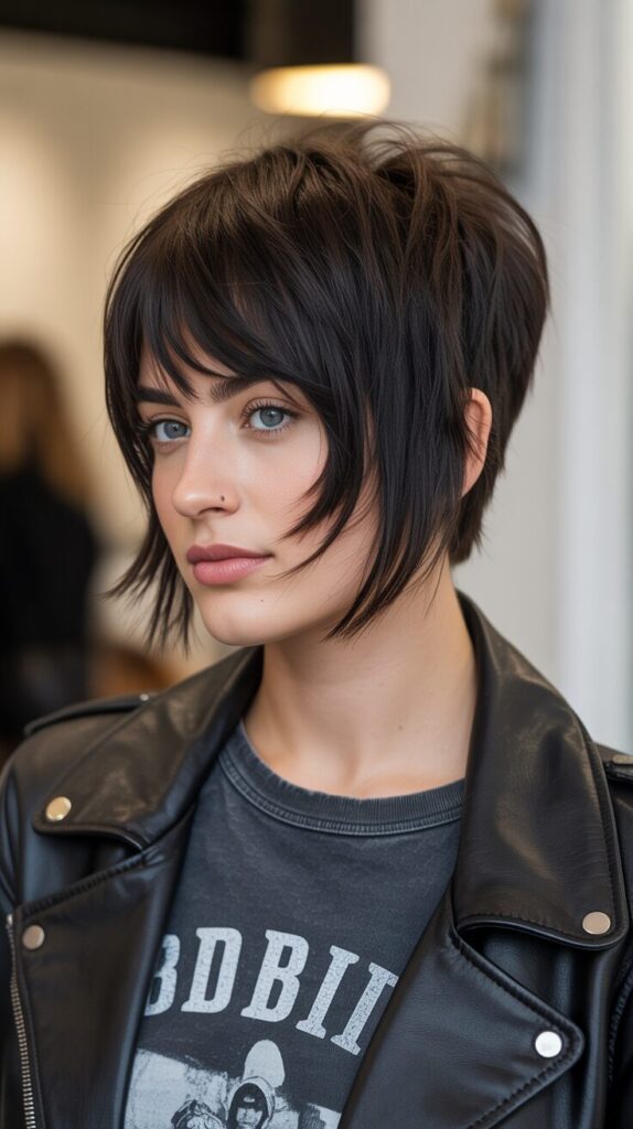 You are about to be ready to showcase the swag of the shaggy look in a pixie wolf cut with straight bangs adding an additional element of edginess to the overall look.