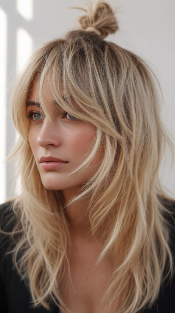 5. Long Shag Wolf Cut with Top Knot and Extended Bangs on Blonde Hair