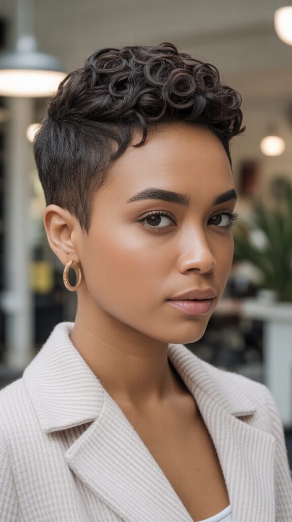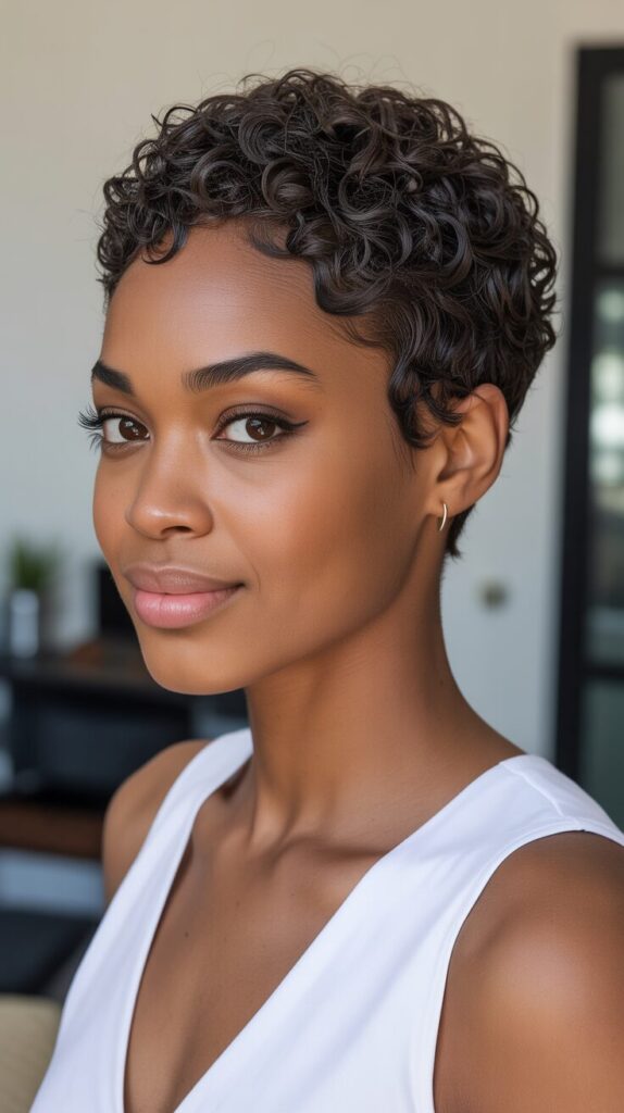 A classic tapered pixie is a great way to show off natural curls while keeping the hair short and stylish. It is easy to maintain with minimal styling products, letting curls shine naturally. The sides are neatly tapered, while the top retains volume and texture for a chic look. It works well for professional settings, casual outings, or weekend events. It is timeless, flattering, and emphasizes facial features beautifully.
