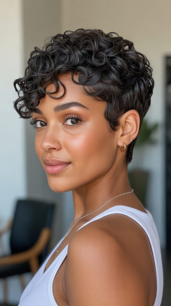 4. Curly Pixie Cut With Side Swept Bangs for Black Women