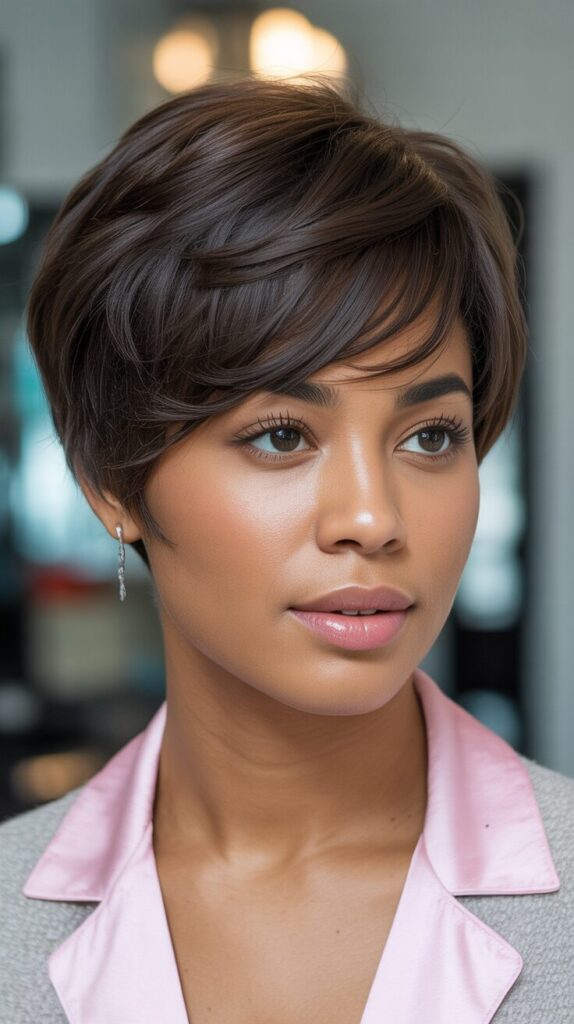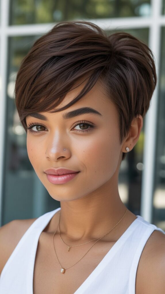 With soft layers and side bangs, this pixie style is delicate and feminine. Layers prevent heaviness, while side bangs frame your face beautifully. Maintaining softness is as easy as styling this haircut with light mousse or cream. This haircut is perfect for a casual or professional look. It enhances facial features naturally with a chic, approachable look.
