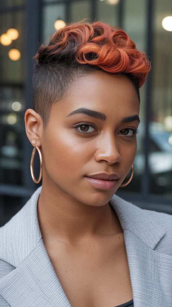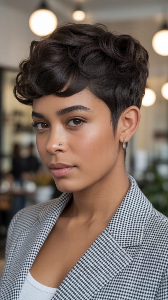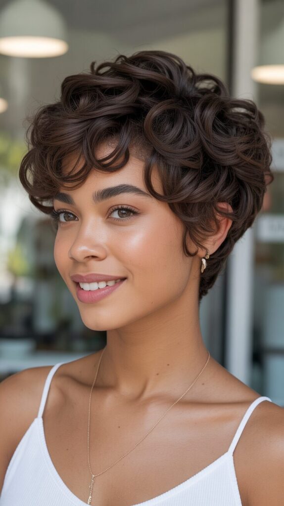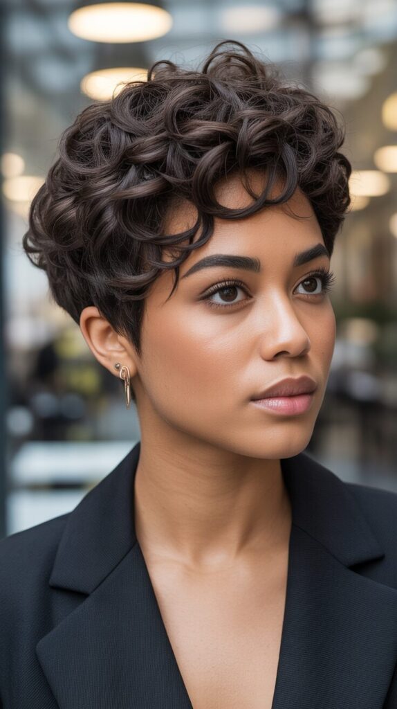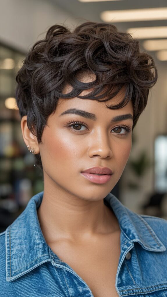 A textured pixie cut with a voluminous top adds personality and flair to short hairstyles. Layers are cut strategically to enhance natural curl patterns while adding movement and depth. Styling with light curl cream or mousse provides a smooth, touchable finish. Perfect for women who want a bold yet feminine look that’s trendy and easy to manage. It highlights cheekbones and adds a youthful touch.
