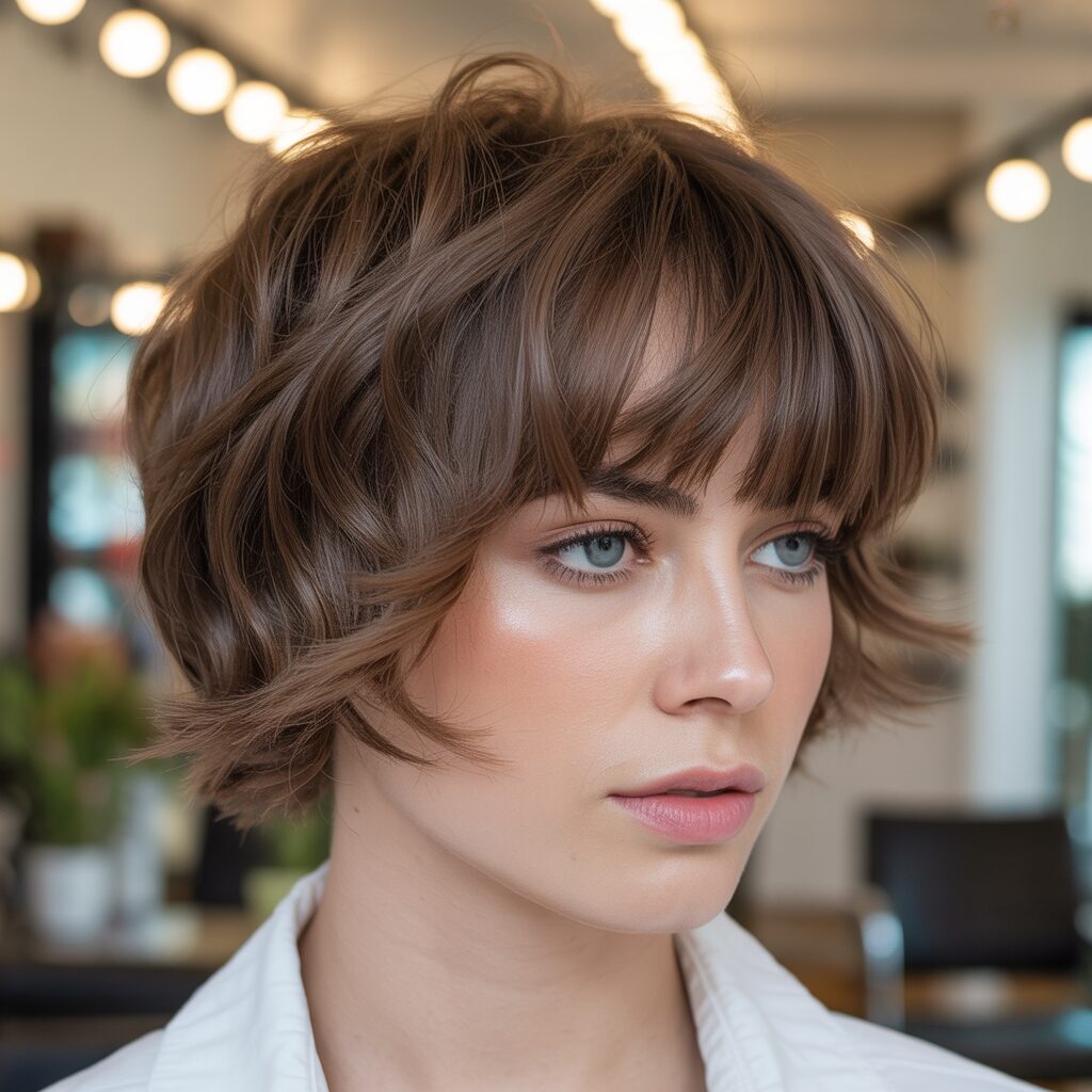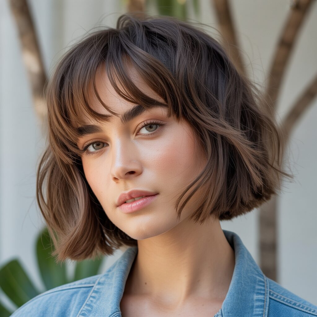With just the right amount of texture, this bob is light and modern, and the fringe skims the brows and draws attention to your eyes in a way that is very flattering. Use a light styling cream, or air-dry mousse, to bring out the movement of the hair.