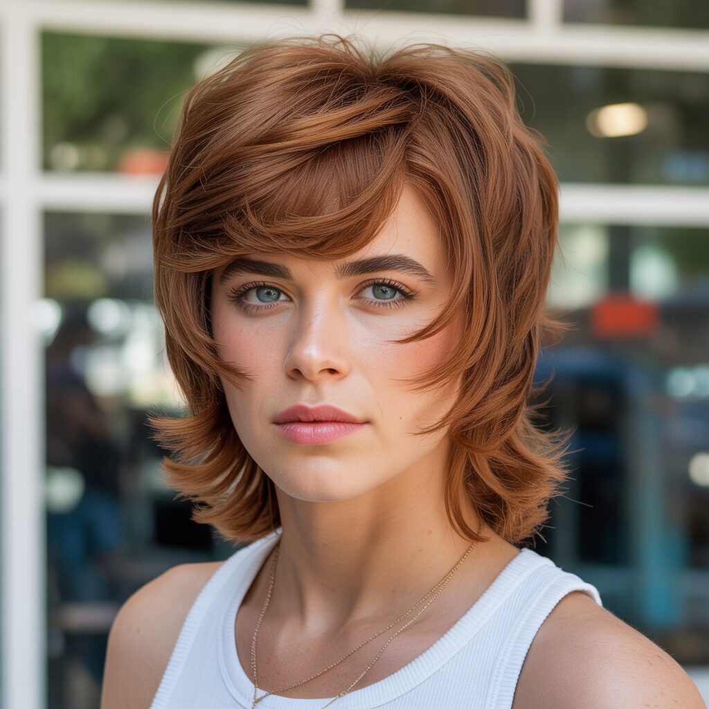 In this shag, you’ll find plenty of throwback charm with its flipped-out ends and layers that lift everything at the crown. It’s cute and playful, and it goes especially well with warm colors like auburn.