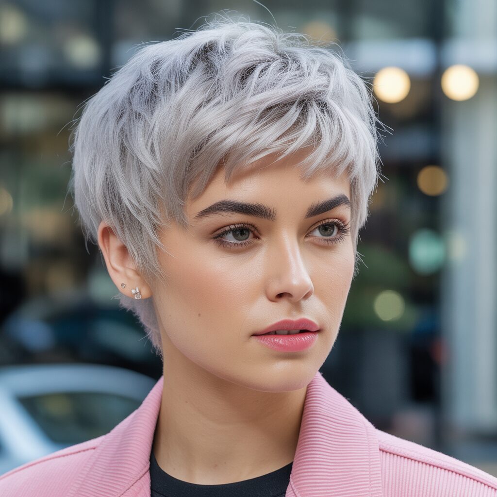 The shaggy cut stands out thanks to its short length and soft, tousled texture. It’s perfect for those who want something low-effort, but feels modern at the same time. If you’re not into silver, this still works well with shades of other colours – it’s all about the shape.
