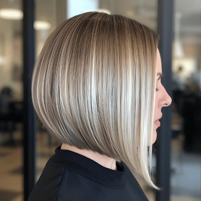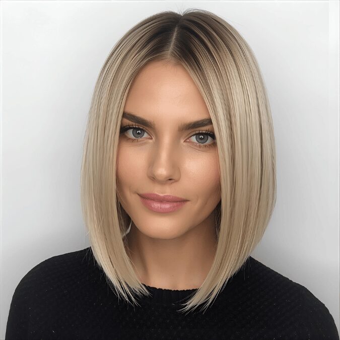 The sleek blonde bob with its clean lines and smooth edges is the ultimate choice for a sleek look. Its clean lines and smooth edges make it the best choice for a sleek look. The one-length cut means your hair falls in a sharp line with some slight layering around your face. You can keep your hair shiny by applying anti-frizz serum to it.