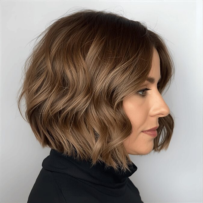 Especially in winter, when worn with a turtleneck like the one shown here, there is something so appealing about a blunt bob with waves. These soft waves give the blunt ends a playful, textured look. A style such as this is ideal for women with medium to thick hair, since it maintains its shape and gives you a balanced look of boldness and elegance.