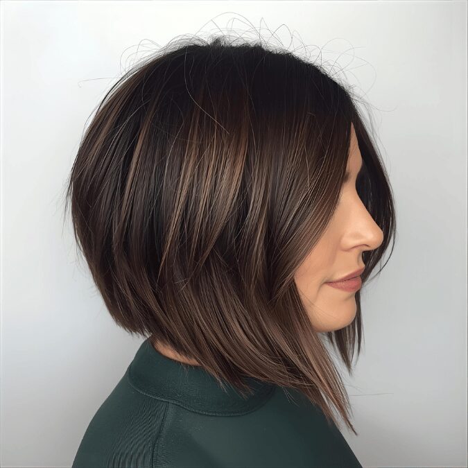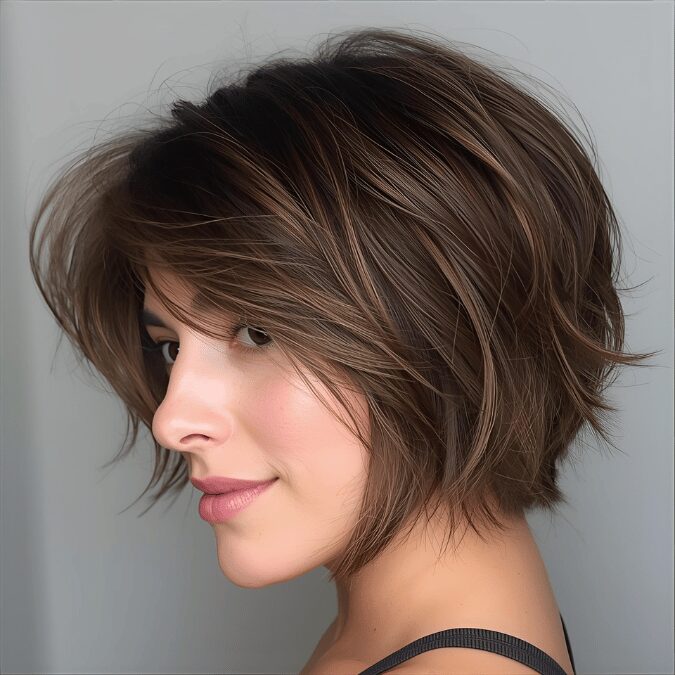 This voluminous layered bob gives you bounce and body in a lovely short brunette package. This cut has layers crafted to lift the hair and make it perfect for women whose hair needs an extra boost of volume. The look thrives on a bit of messy naturalness, so use volumizing sprays or mousses to create a tousled look at your roots and ends.